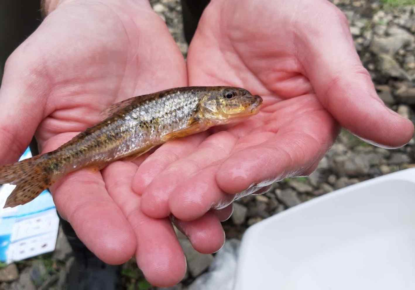 Only the size of a chicken goujon, this Gudgeon (Gobio gobio), a widely unknown species of fish, is in fact quite a large example of its kind. Gudgeon are not frequently recorded in Ireland and are often over looked as part of our freshwater fish communities. This individual of the species was recorded during a river education event held on the Allow River by IRD Duhallow as part of the RaptorLIFE project. Gudgeon forage on sandy and gravelly substrates in both fast and flow moving streams using the barbels on either corner of their mouths to detect their prey. They feed on a variety of invertebrates and have been known to graze on filamentous algae in Ireland. The species is not fished commercially or for sport in Ireland, however in Victorian and Edwardian times it was fashionable to fish for and fry Gudgeon. Indeed the word goujon is derived from the French name for the fish.